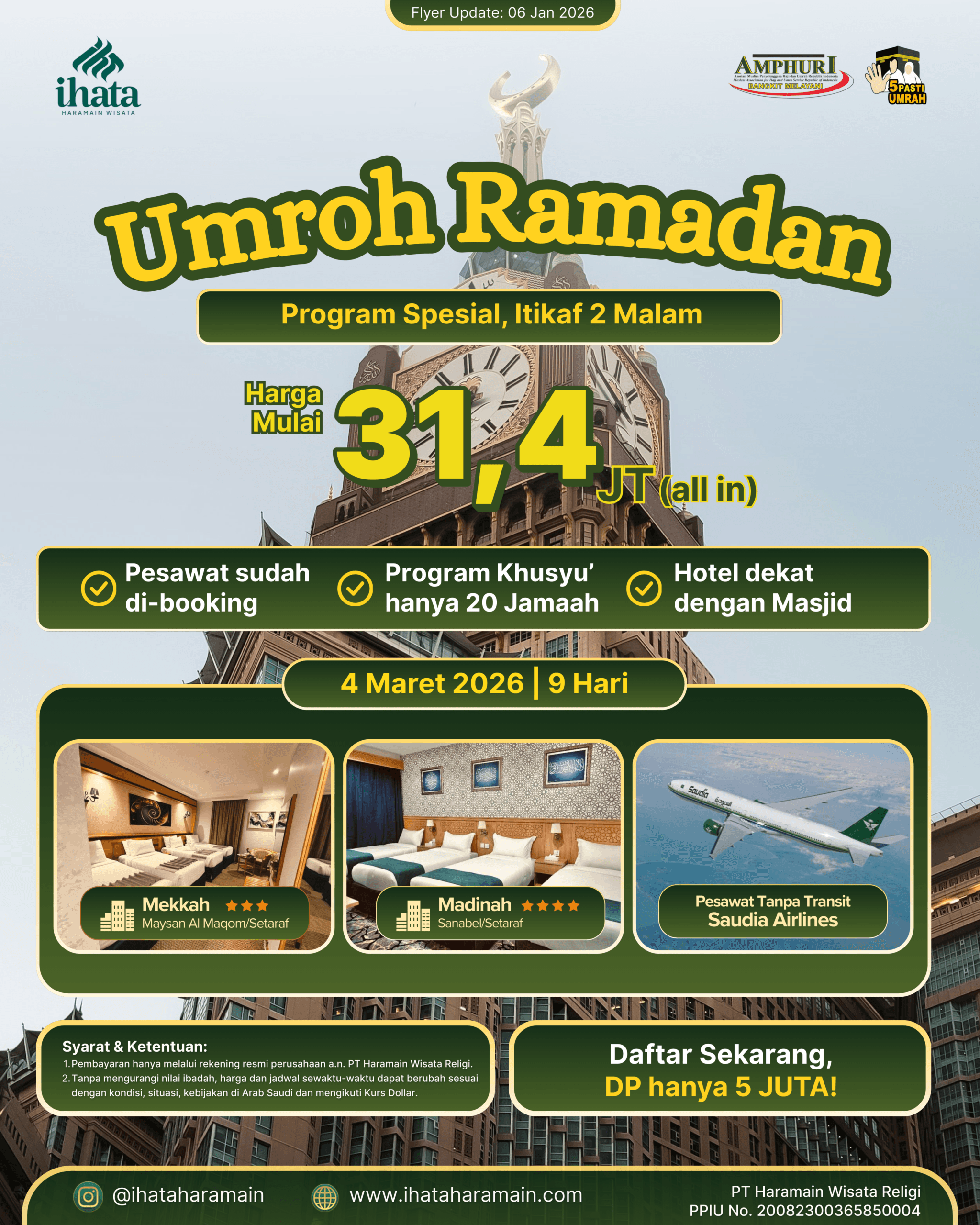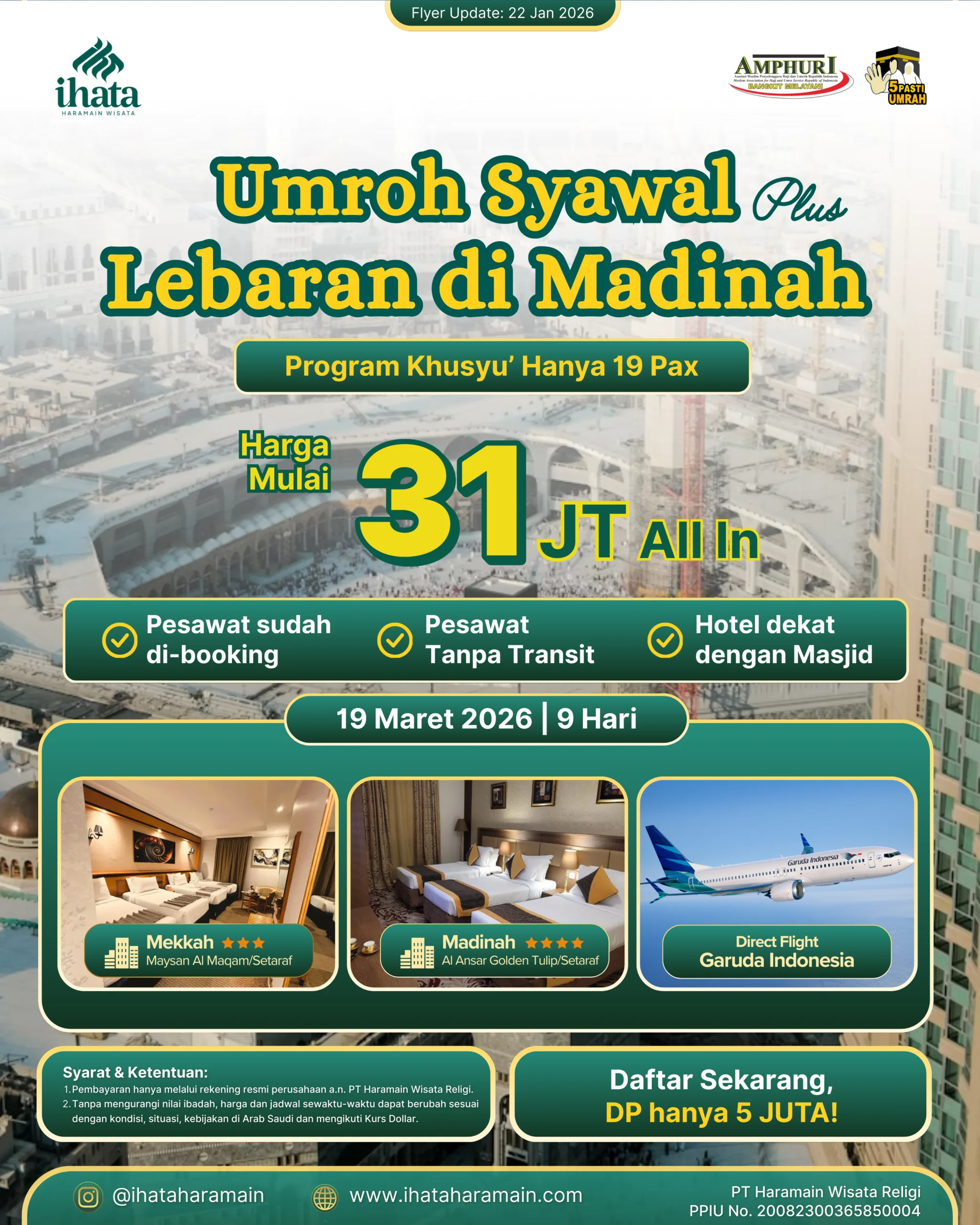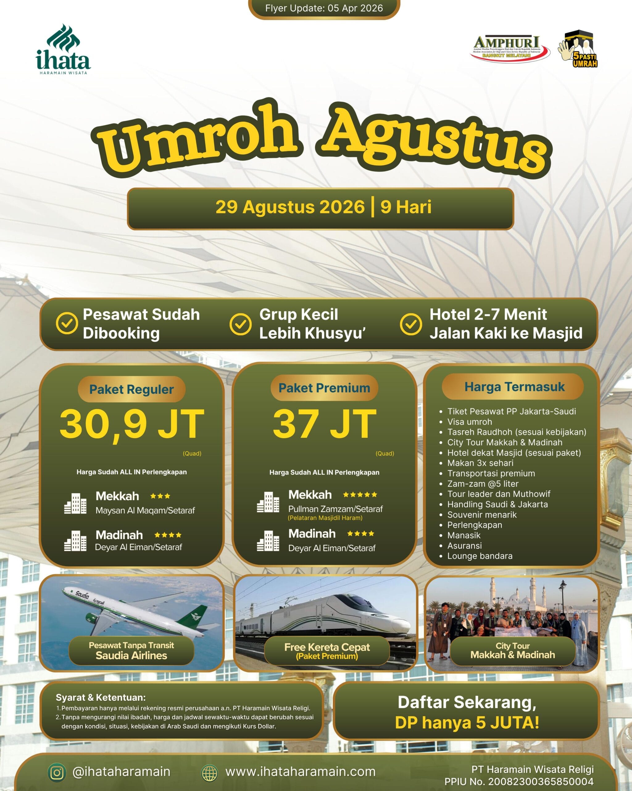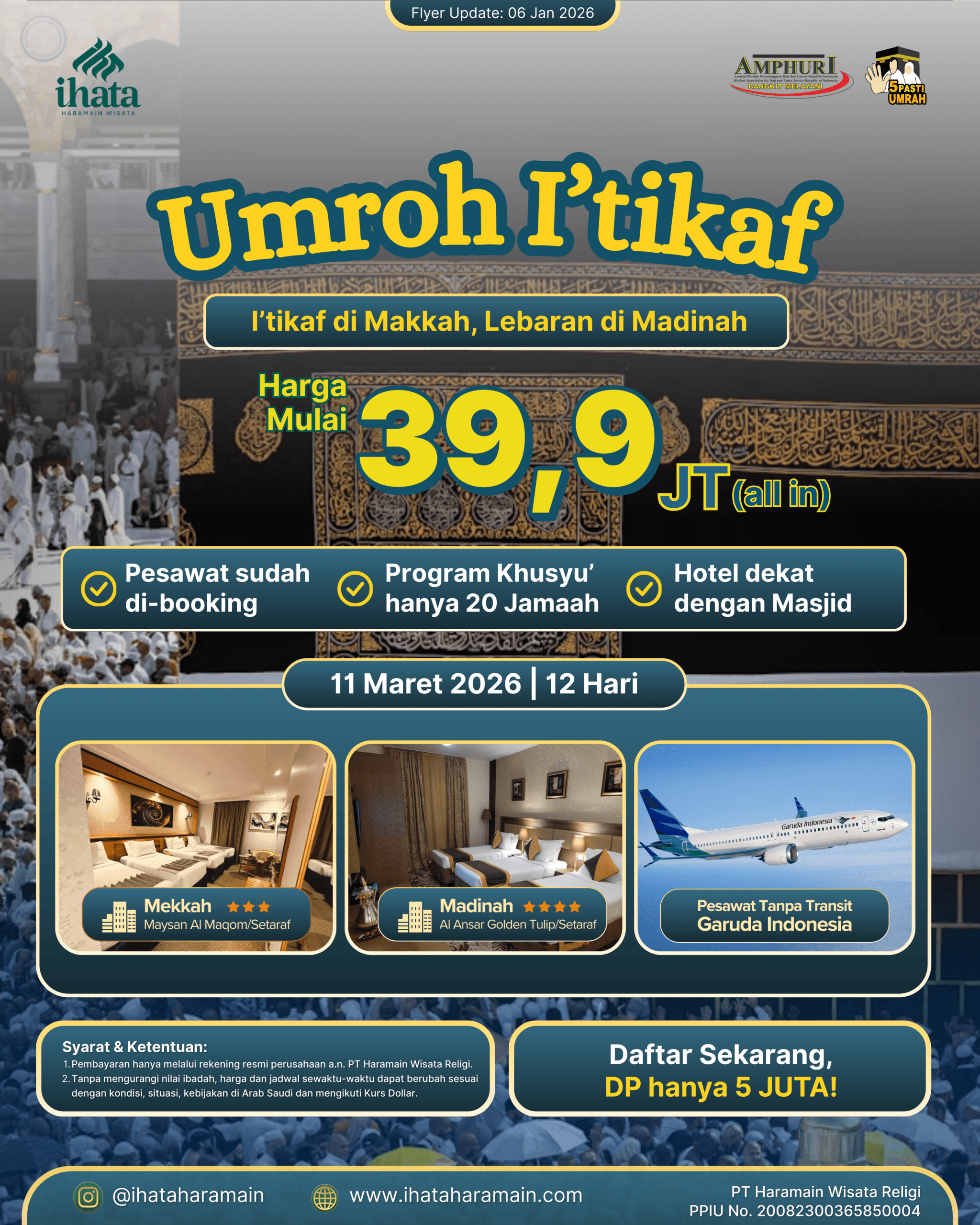 Jadwal keberangkatan menyesuaikan dengan program yang kami buat. Tapi, kalau kamu mau umroh private, bisa banget! Langsung request aja ke tim IHATA. Kamu bisa menentukan tanggal, akomodasi, dan fasilitas sesuai dengan kebutuhanmu.