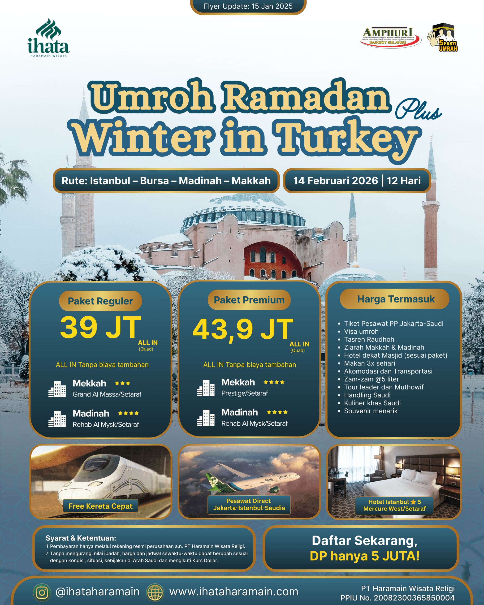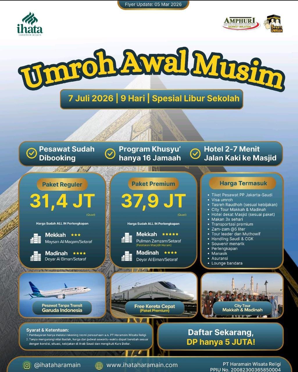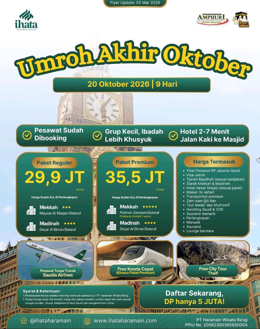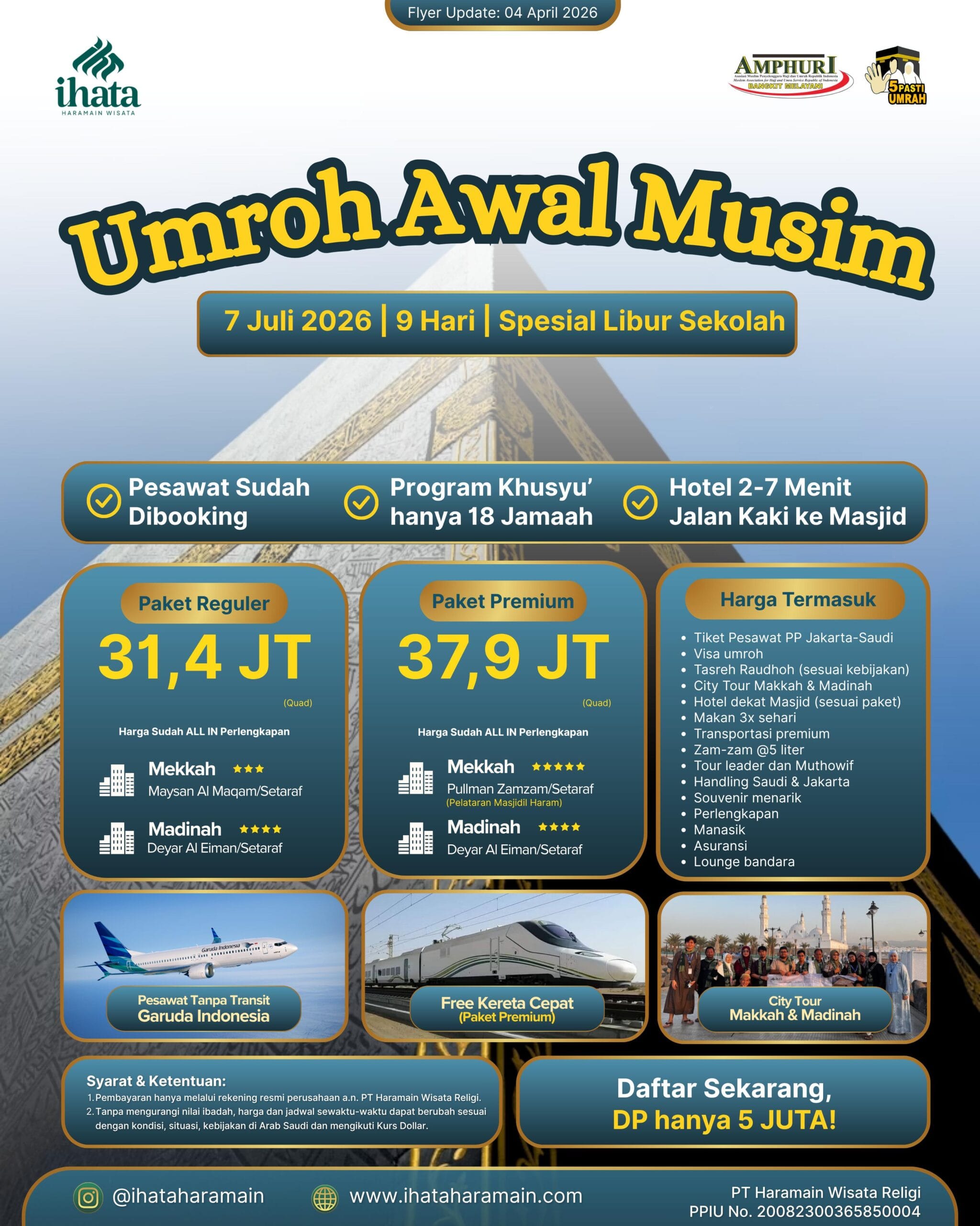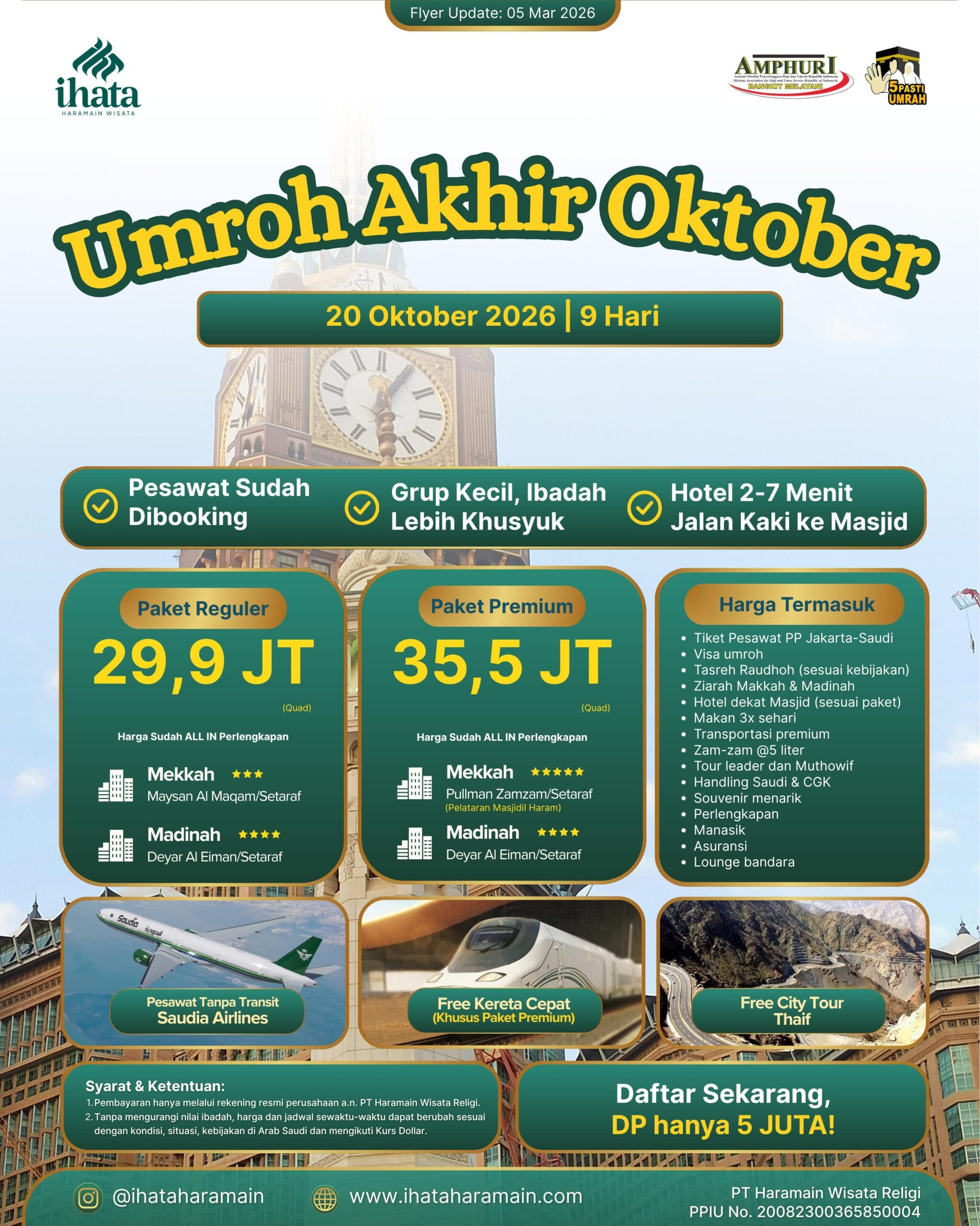 Jadwal keberangkatan menyesuaikan dengan program yang kami buat. Tapi, kalau kamu mau umroh private, bisa banget! Langsung request aja ke tim IHATA. Kamu bisa menentukan tanggal, akomodasi, dan fasilitas sesuai dengan kebutuhanmu.